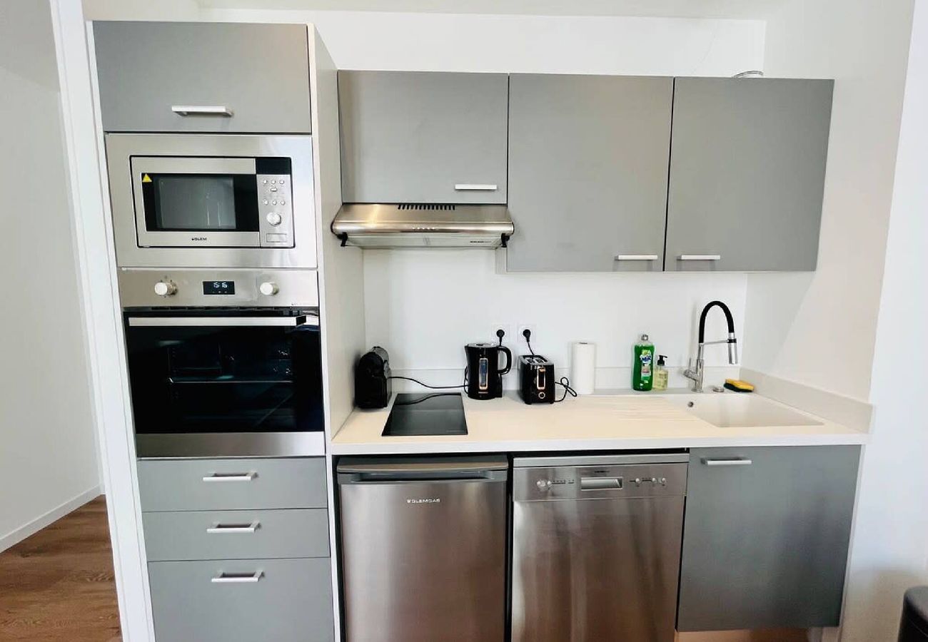La cocina americana, eléctrica, está equipada con nevera, microondas, horno, lavavajillas, vajilla/cubertería, utensilios/cocina, cafetera, tostadora y hervidor de agua.