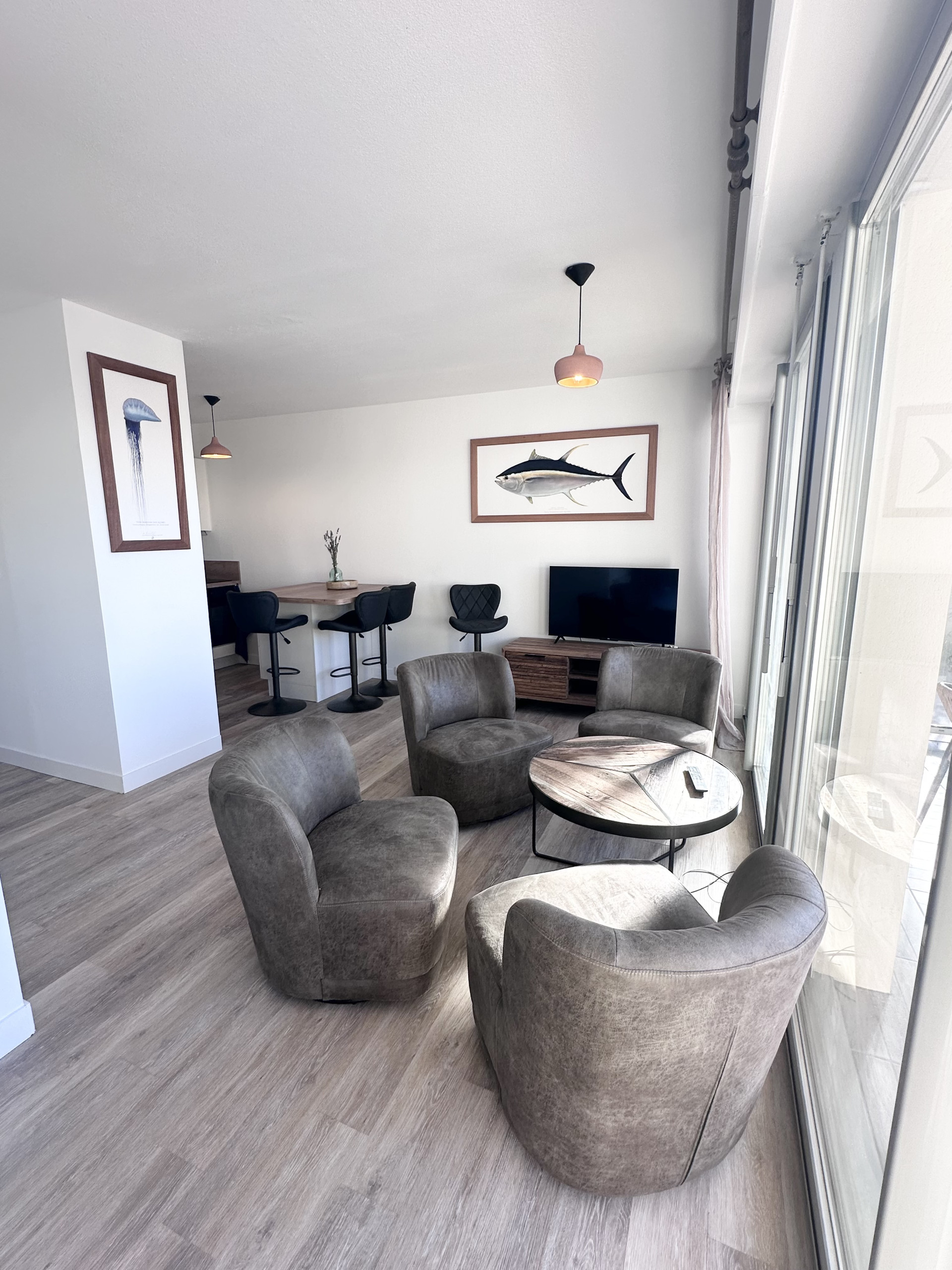 La cuisine ouverte sur la pièce de vie est toute équipée (réfrigérateur, congélateur, plaques de cuisson, four, cafetière Nespresso, bouilloire, etc.). Enfin le salon avec son canapé-convertible dispose également d'une table basse, d'une TV avec WIFI et d'une table à manger.