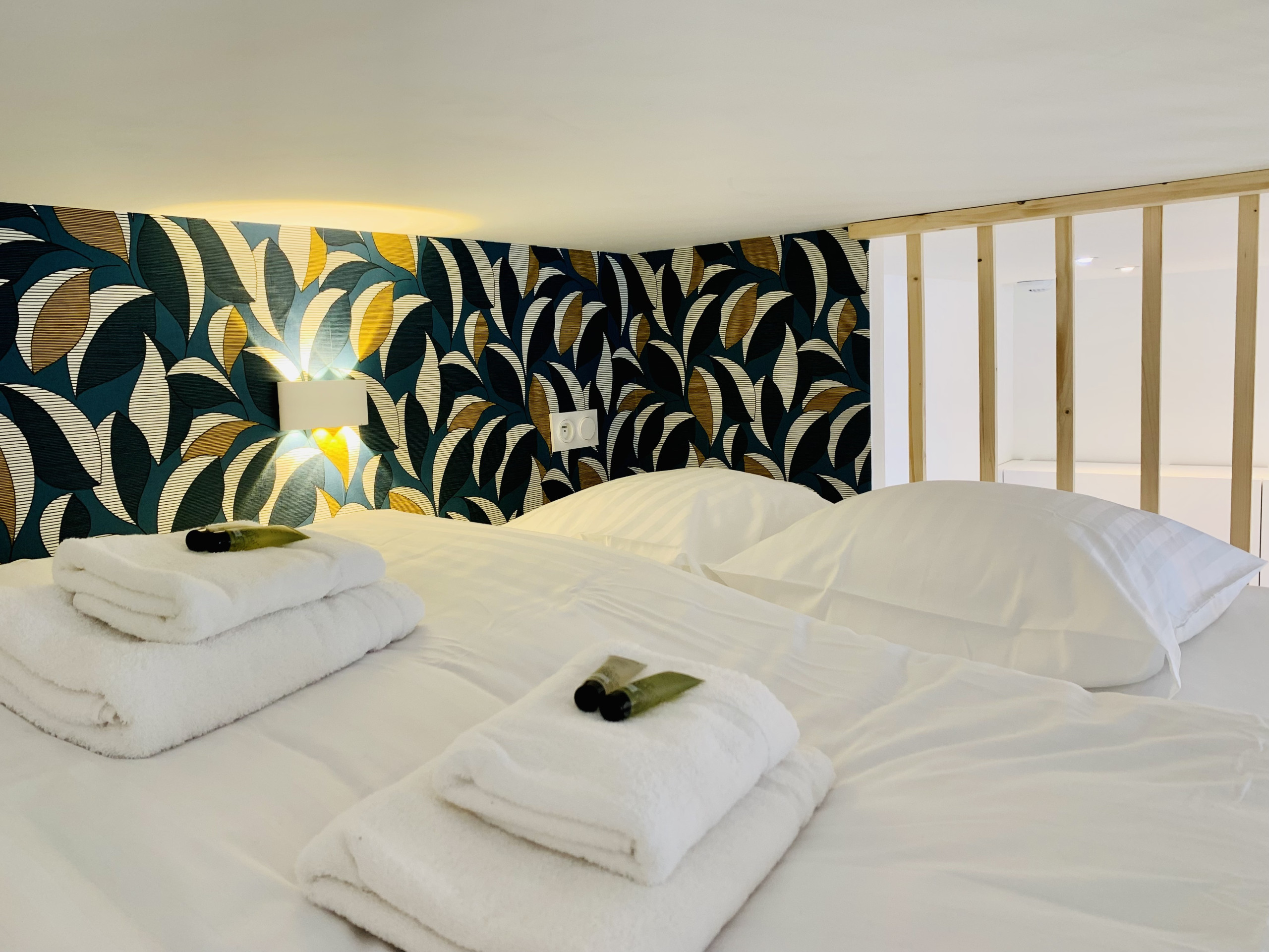 • Chambre de 13 m² : lit double 160x200, lit mezzanine 120x200, coin bureau. La chambre donne sur une cour intérieure, assurant calme et tranquillité.