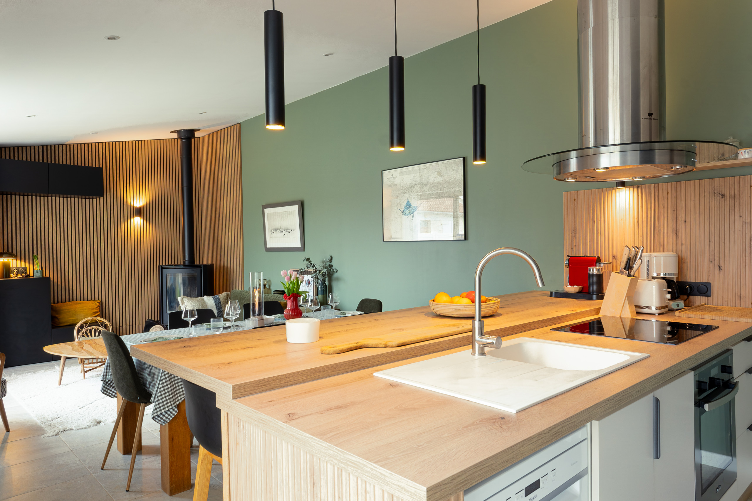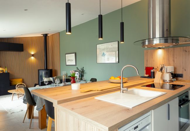 Au rez-de-chaussée, vous pourrez profiter de son grand espace de vie avec sa cuisine ouverte sur la salle à manger et le salon (avec TV et WIFI)